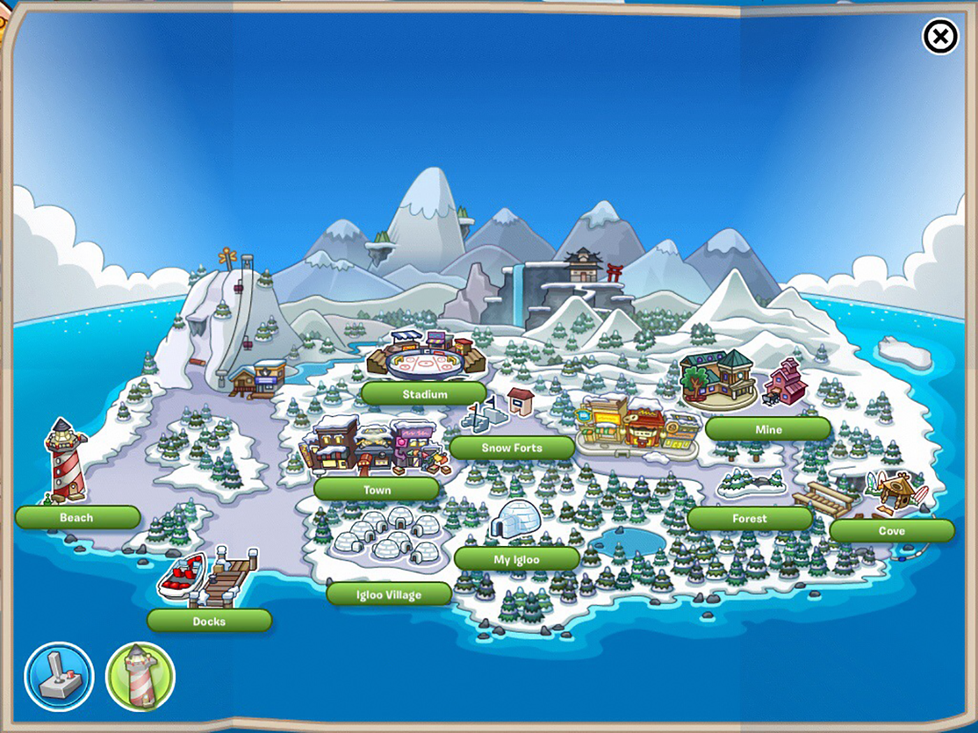 Screenshot of Club Penguin 1.2. Bottom HUD with my icons.