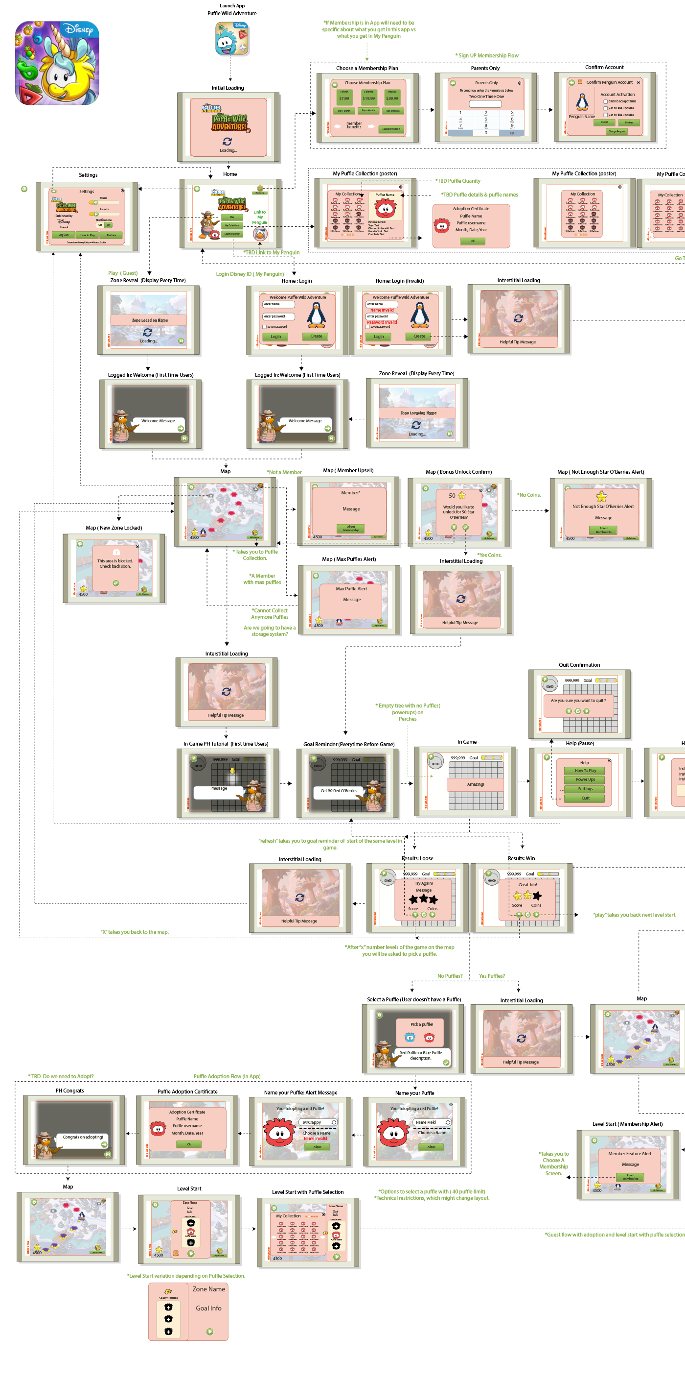 Wireframe info graph of app flow experience for Club Penguin's Puffle Wild for iOS