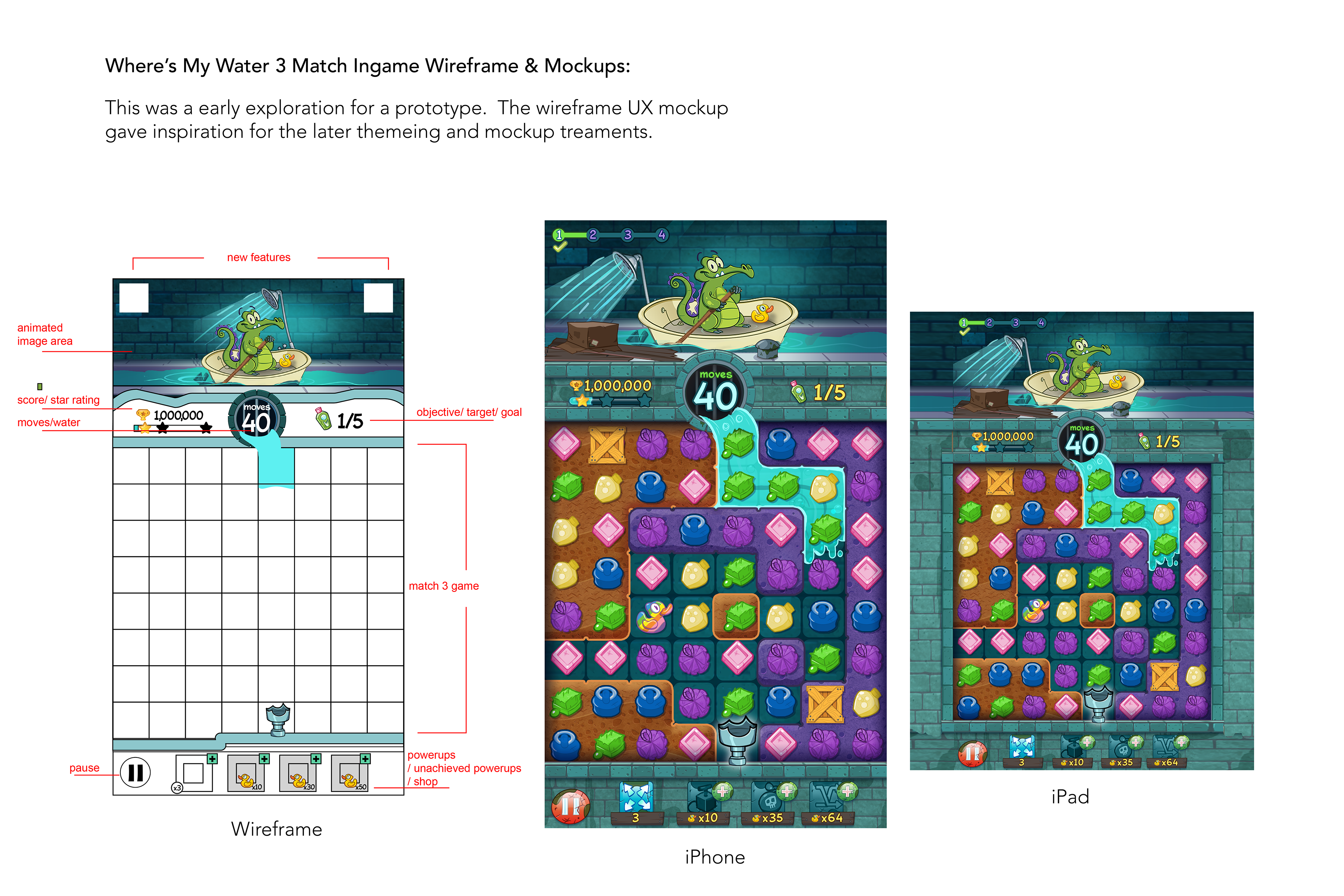 This is a wireframe based on the developing an experience for crafting in a casual match 3 and collection conceit for the Disney brand of Where's My Water 3.