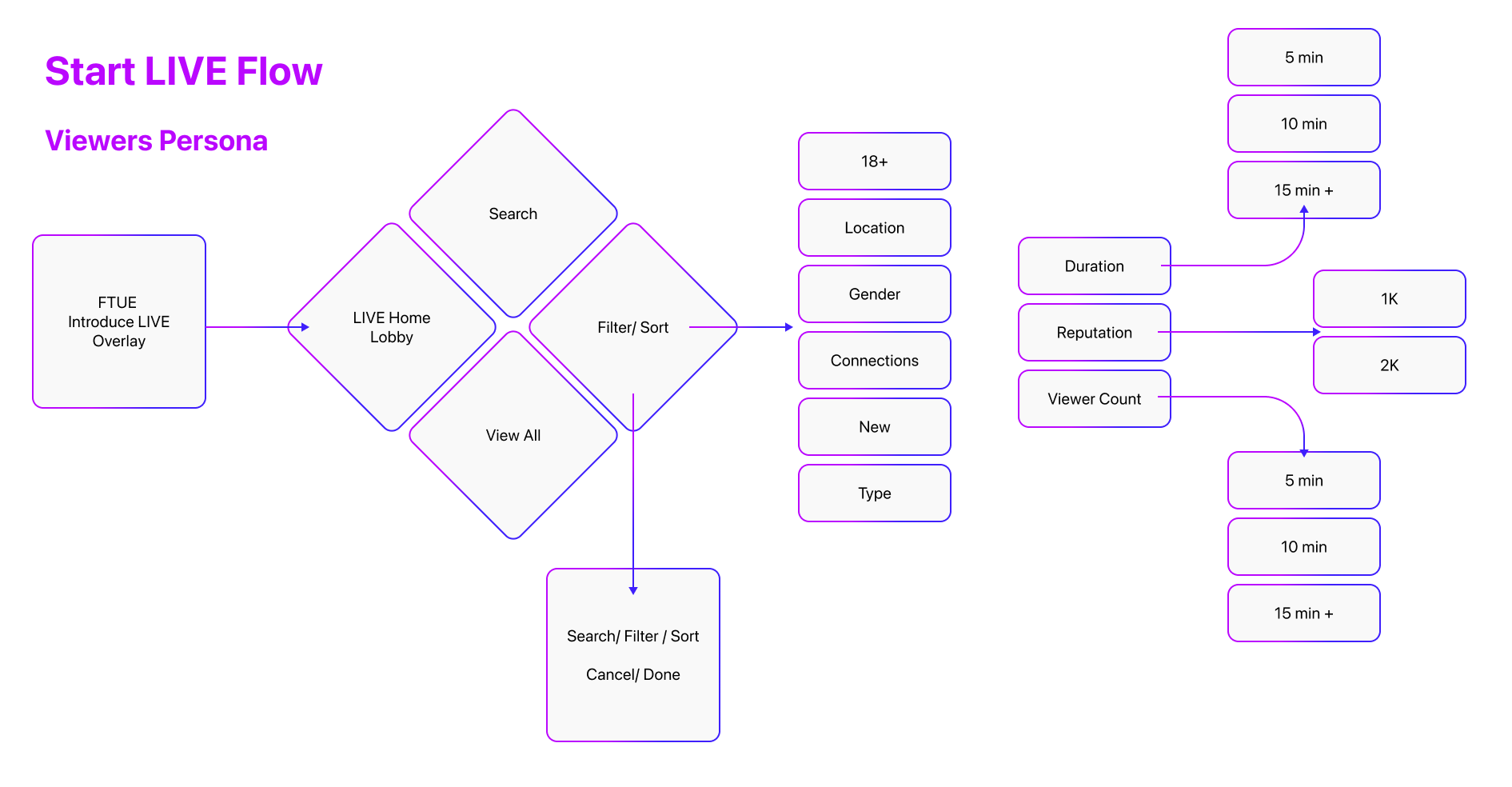 Solution: After researching competitors, including the MeetMe app, I collaborated with my Product Manager to create a minimum viable product as a proof of concept for a new in-house LIVE feature. I designed comprehensive user flows, wireframes, prototypes, and design paradigms with measurable outcomes while simultaneously helping to build the engineering team. The experience covered key user journeys such as finding and joining a LIVE stream, starting and ending a stream, chatting, gifting, managing groups and channels, exploring various LIVE modes, and integrating monetization and interactive games—all forming the foundation for MediaLab’s scalable LIVE ecosystem.