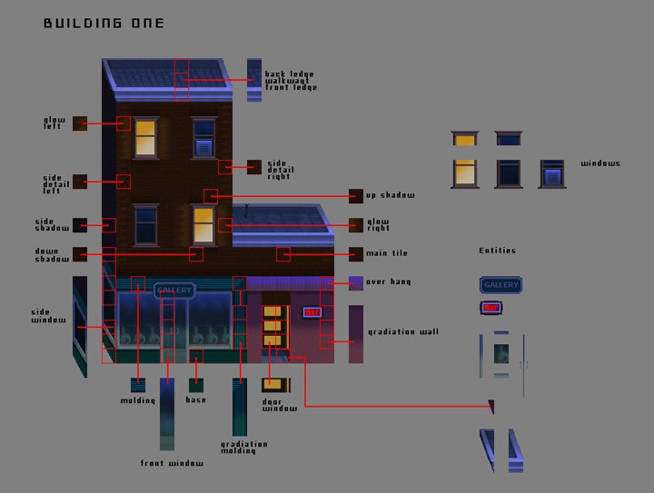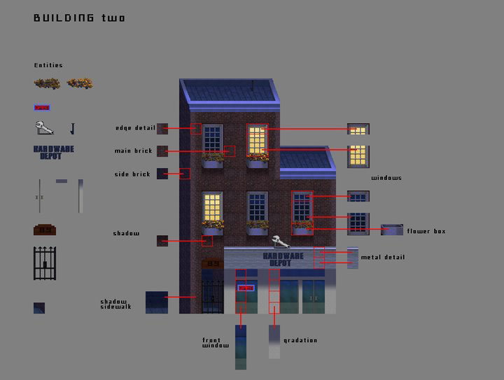 Spiderman 3 : Action mobile game, launched in 2007. I worked as a production artist and concept artist responsible for UI design, avatar portraits, and background art. Below images ( building 1,2,&3) show a break-down of building tiles and optimization thought process.