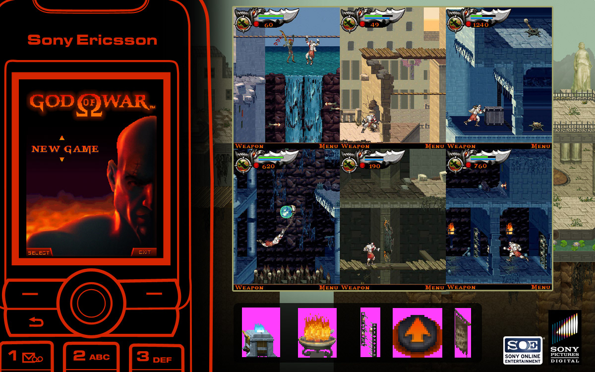 God of War: Beytral mobile game, launched in 2007. Was based on the God of War franchise for Playstation. The game won mobile game of the year in 2007. I worked as a production artist and concept artist responsible for UI design, menu screens, background art, and animations.