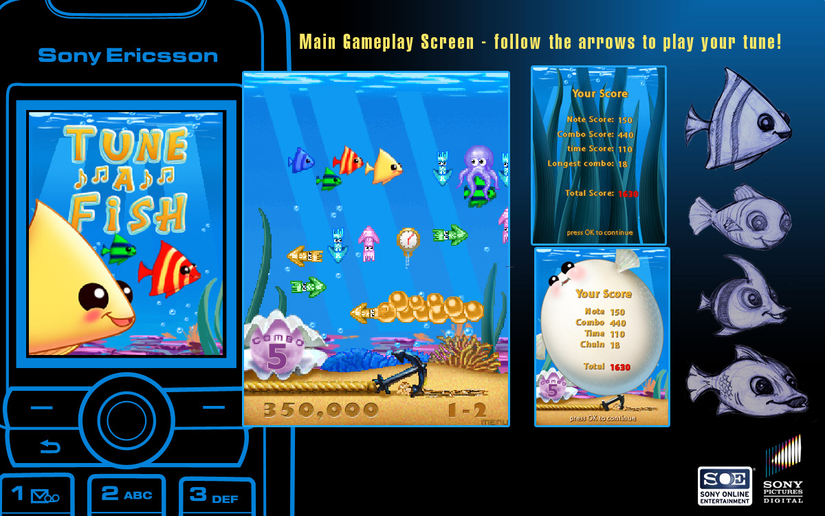 Tune-A-Fish mobile game, launched in 2007. Was a new IP based on music. Using the dpad on your cell phone you can follow the squid arrows in the game screen. As you click on the correct arrow it will play a catchy tune! I was responsible for the character design, title screen, user interface, menu screens, and background art.