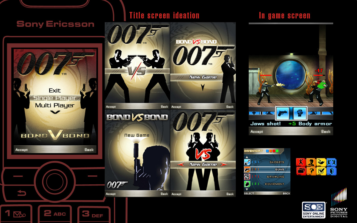 Bond vs Bond mobile game, launched in 2007. I worked as a production artist and concept artist responsible for the title screen and some user interface icons.