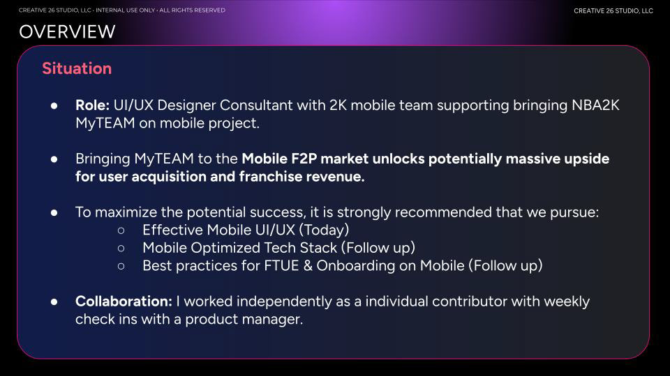 Story: I helped translate NBA 2K’s MyTEAM from console to mobile, designing the foundational UX and Home Screen framework while introducing mobile-first patterns such as a bottom navigation bar, streamlined FTUE, and clear call-to-action flows—contributions that shaped the product’s launch experience and informed future 2K mobile design standards.