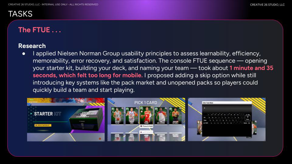 Goals: As a Senior UI/UX Designer on the NBA2K franchise, I was brought in to help evolve the MyTEAM experience from console to mobile and address major engagement challenges. Data showed that 40% of players never played their first game, and mid-funnel retention dropped sharply due to poor first-game win rates—40% overall and only 9% when starting online. Since 47% of pack purchases happened after seven days, early player success was key to retention and revenue.