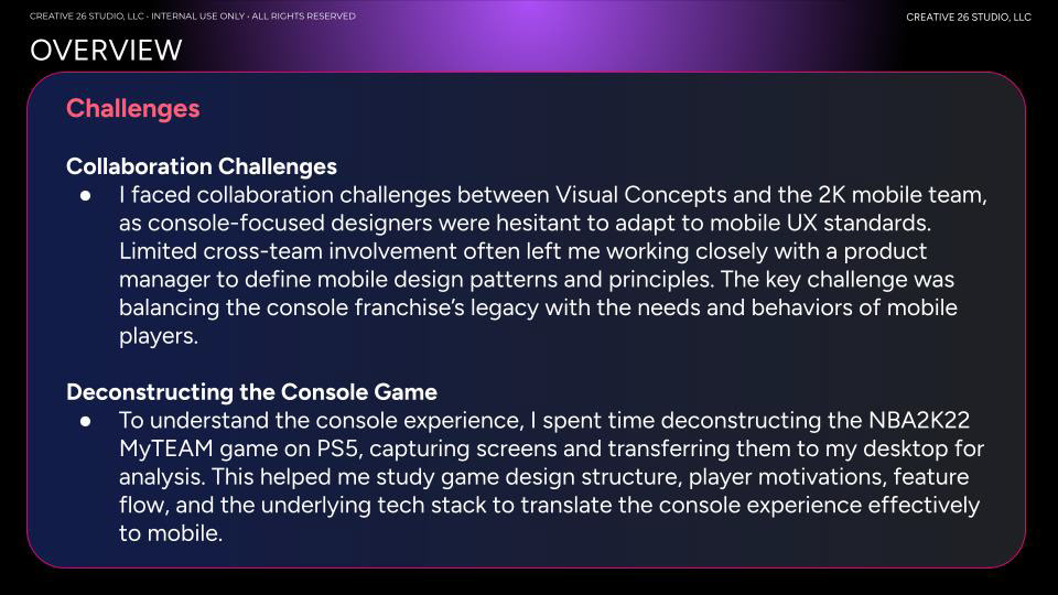 Challenges: The NBA2K MyTEAM mobile project faced significant collaboration challenges between Visual Concepts, the console franchise developers, and the 2K mobile team. While Visual Concepts had tremendous success on console, they were resistant to adapting designs for mobile and struggled to see the value in established mobile standards and best practices. This created communication gaps, creative tension, and at times, fragmented development across teams.