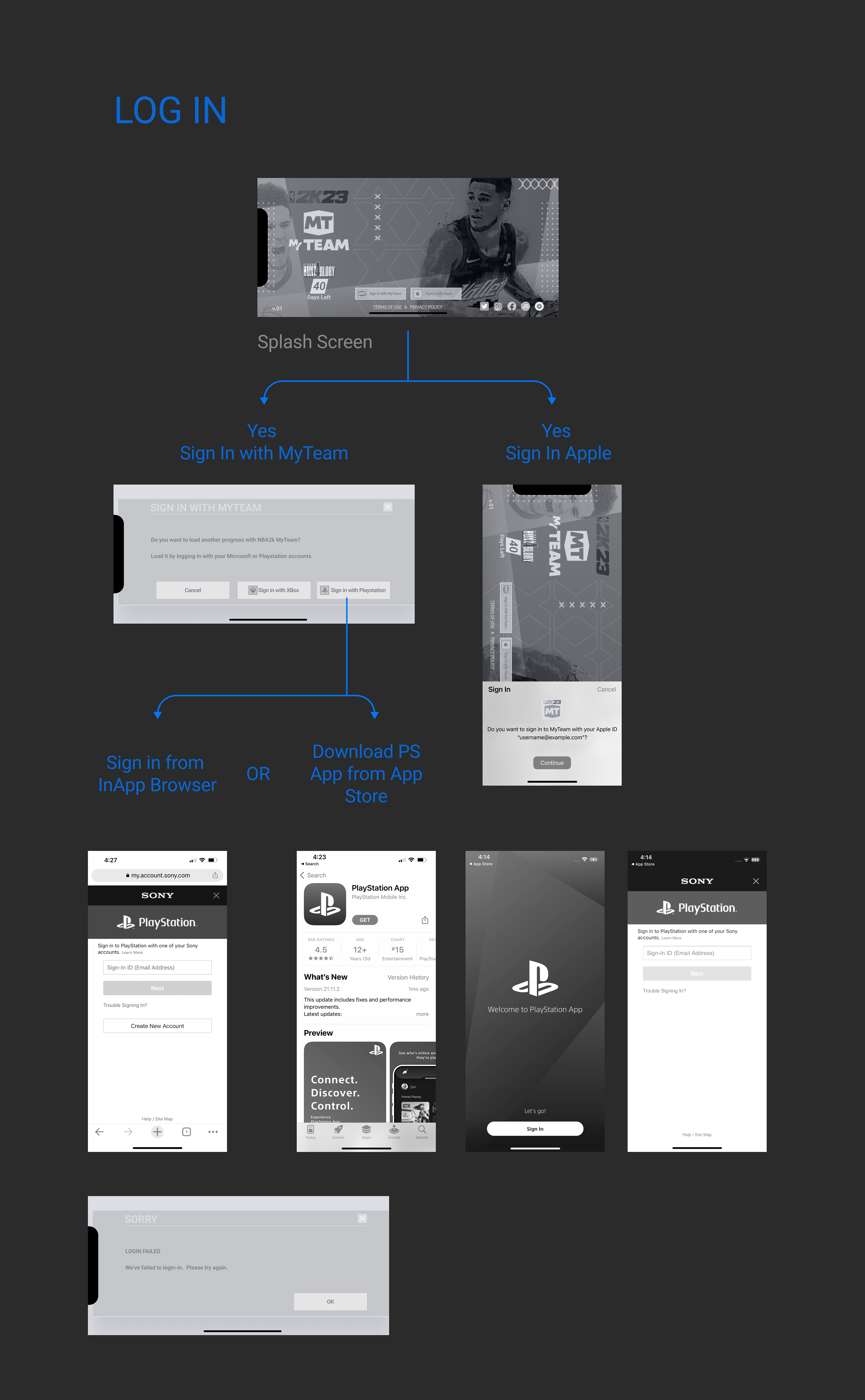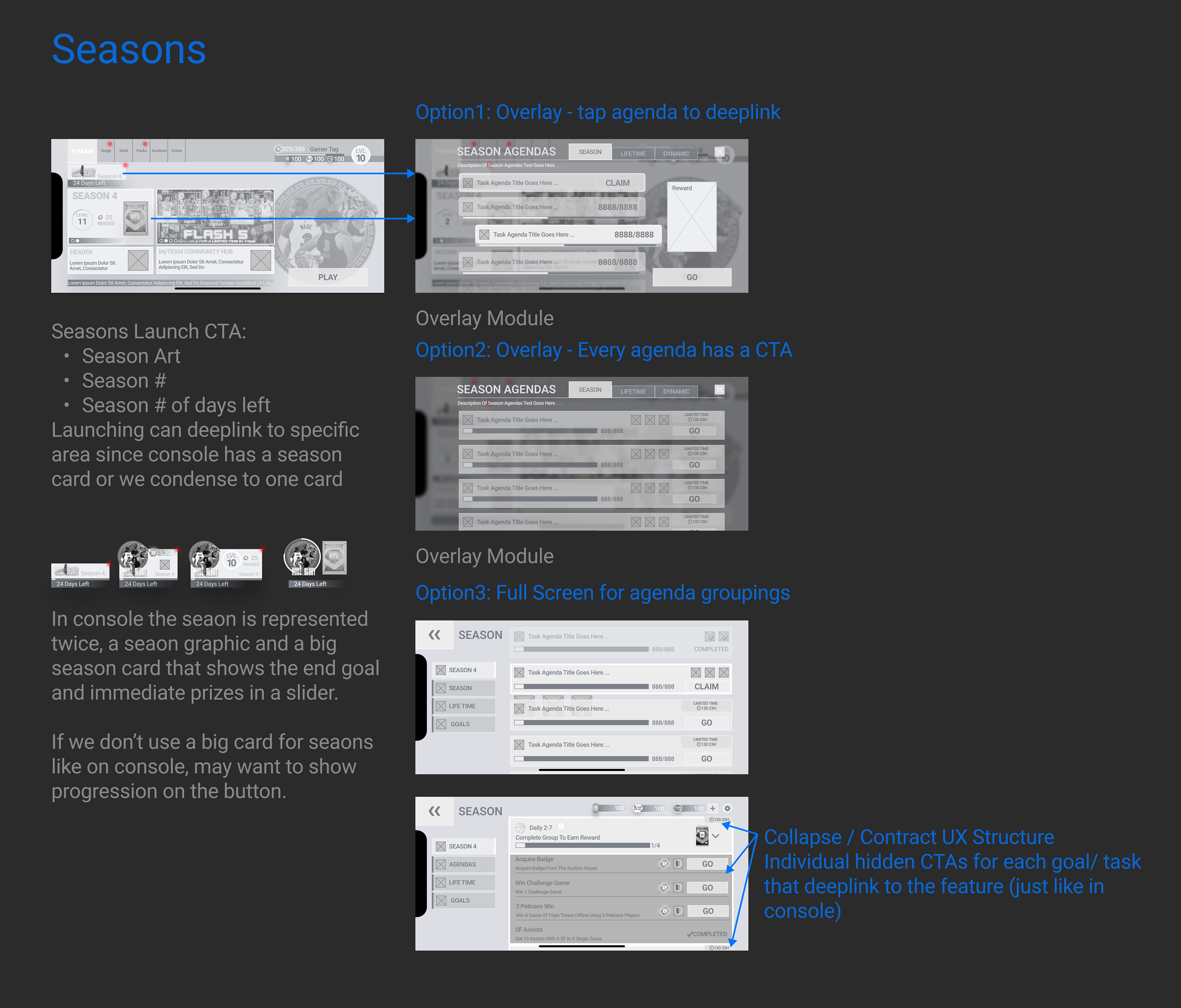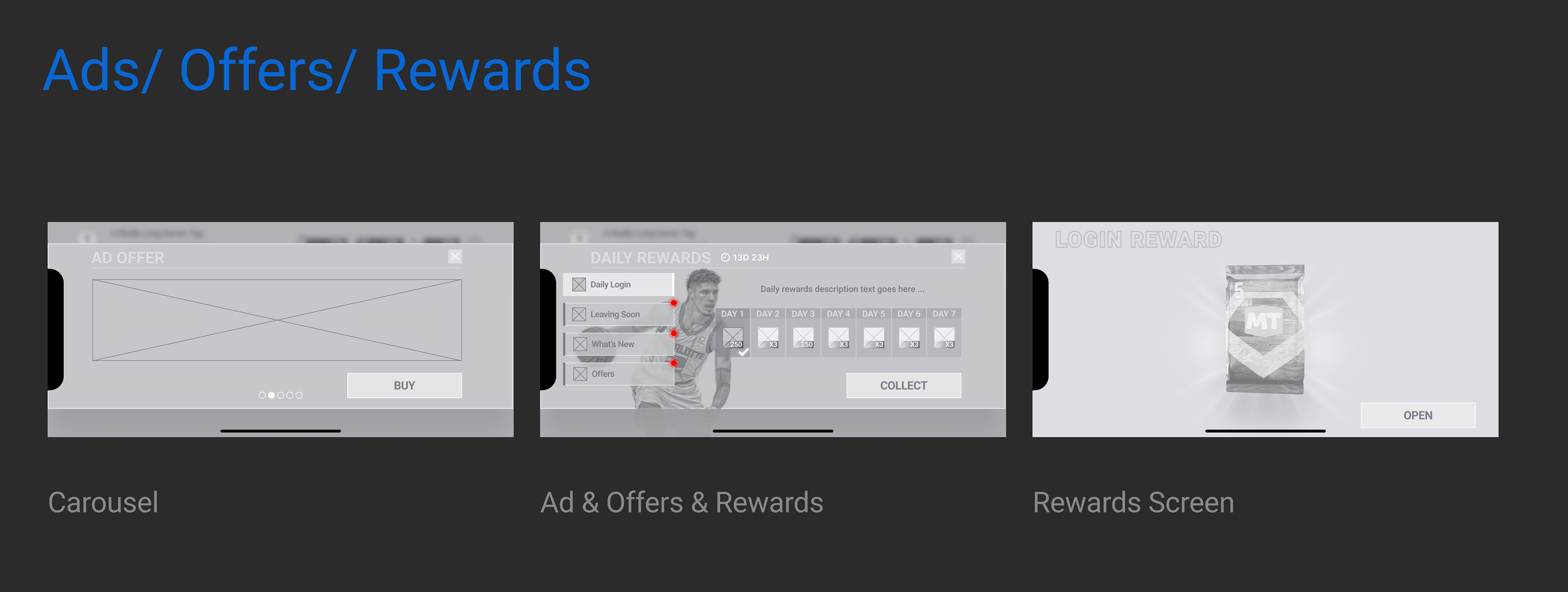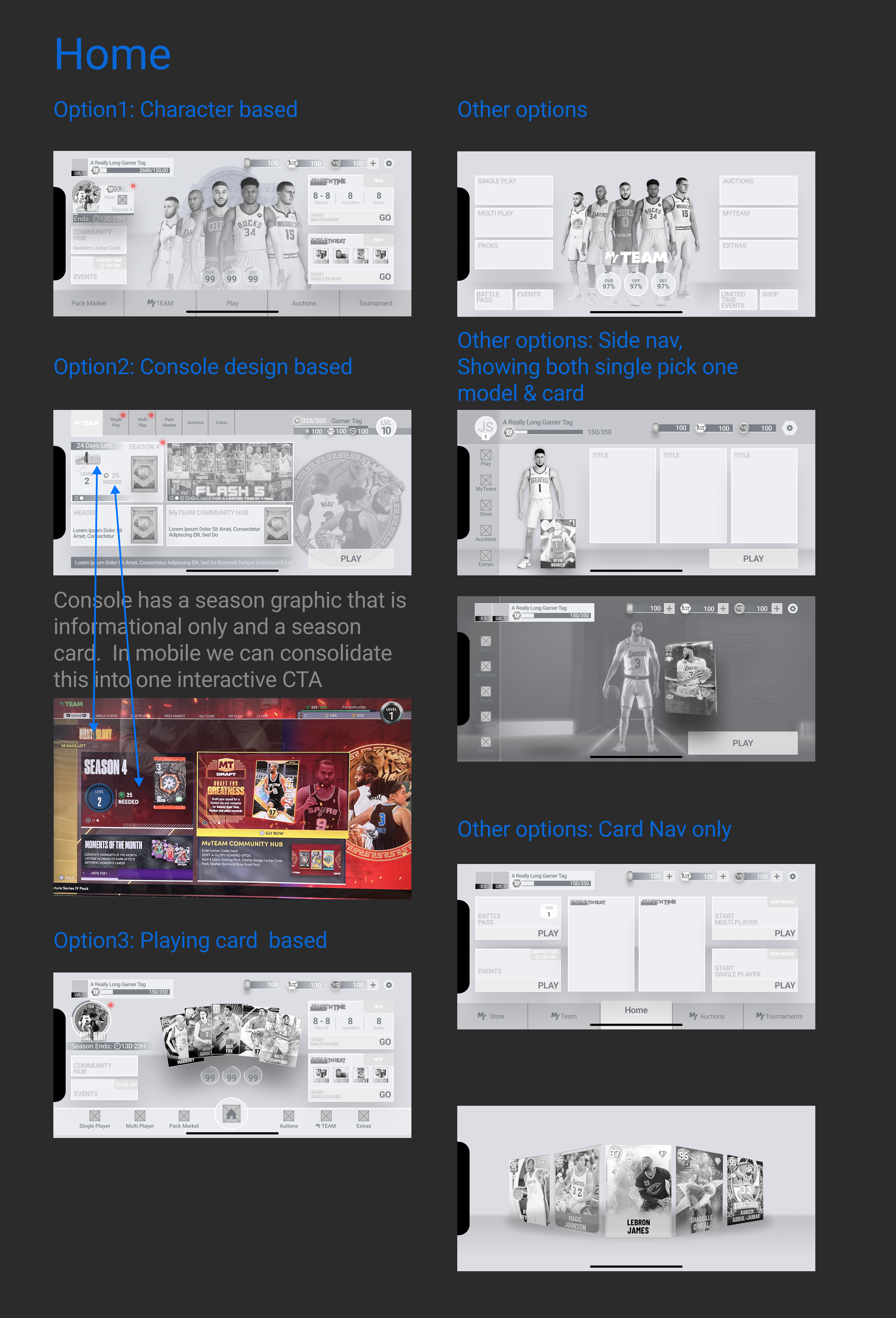 The final MyTEAM launch bears a strong resemblance to the wireframes I created in 2022. My work included a range of mockups and concepts featuring player cards, 3D avatars, and a fully realized version of the console experience. Key design elements—such as the bottom navigation and the prominent "GO!" CTA in the bottom right—were solutions I advocated for to ensure clear prioritization of the core gameplay action. The top HUD closely mirrors the console layout, though I also explored a variation with the player profile positioned on the left. For the central content and promotions area, I proposed carousel designs consistent with the console version, and the final implementation closely reflects those concepts from my 2022 designs.