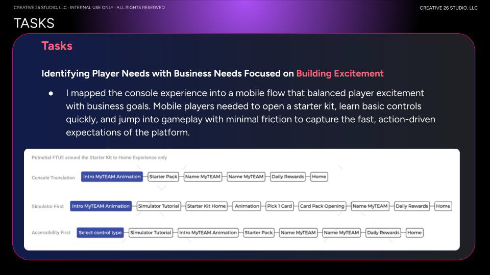 Working closely with the Product Manager, I communicated the FTUE and overall user flow for the MyTEAM mobile experience. Using mobile best practices and insights from competitors like EA Sports, I delivered a design that preserved the spirit of the console franchise while improving usability, accessibility, and player engagement on mobile.