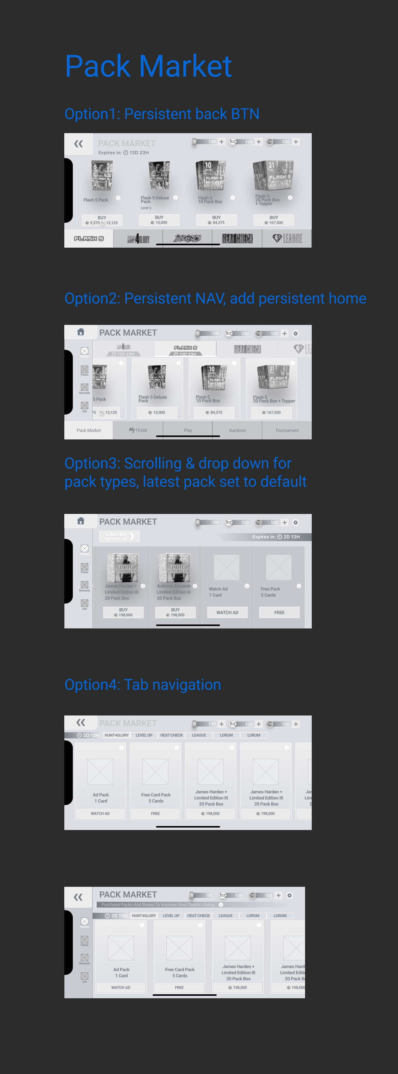 The Pack Market maintains strong consistency with mobile design best practices while effectively translating the console experience. As one of the first UI/UX designers on the project, I introduced the purchase zone design pattern for individual card packs and bundle offerings. I backed this approach with research and data, ultimately advising the team to shift away from the original console layout in favor of this more intuitive and mobile-optimized solution.